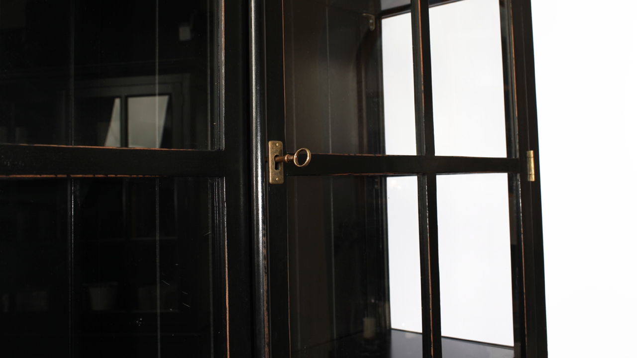 Vitrinskåp i svartmålat trä.